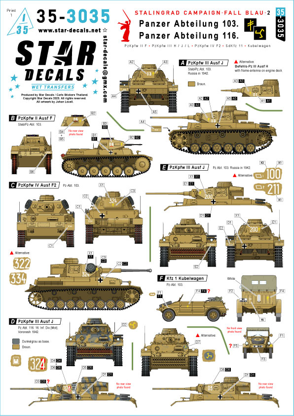 Stalingrad Campaign - Fall Blau # 2. Panzer Abt. 103 & Panzer Abt 116. PzKpfw II F, PzKpfw III H/J/L, PzKpfw IV F2, SdKfz 11, Kubelwagen.