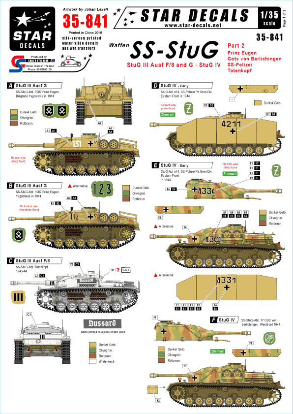 StuG III Ausf F/8, Ausf G and StuG IV. Prinz Eugen, Götz von Berlichingen, SS-Polizei. Note: Theres been a discussion about the StuG 'Bussard' if it really belonged to Totenkopf or not. Missing-Lynx.