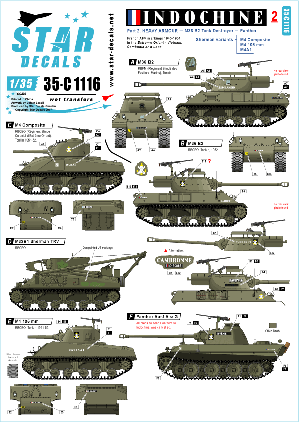 Indochine # 2. Heavy Armour in Indochina. RBFM and RBCEO - Sherman M4 Composite, M4 105mm, M4A1, M36B2 Tank Destroyer, M32B1 TRV, Panther A or G (hypothetical markings as no Panther tanks was ever delivered).