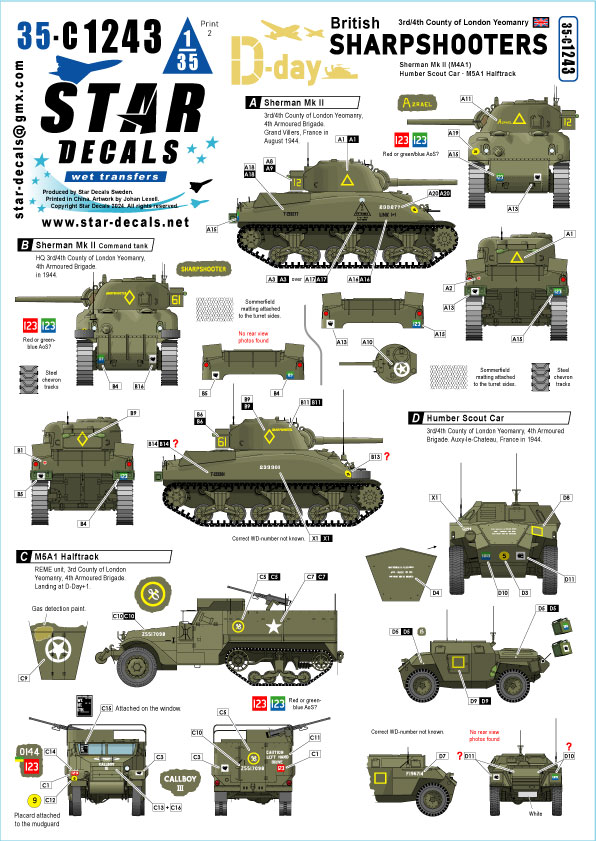 British Sharpshooters. D-Day Special. Shermans and AFVs of 3rd/4th County of London Yeomanry (The Sharpshooters). Sherman Mk II, Humber Scout Car and M5A1 Halftrack.