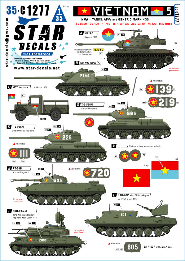 Vietnam # 5. NVA North Vietnamese Tanks and AFVs markings. T-34/85M, SU-100, BTR-50P (AA), PT-76B, ZSU-23-4M SPAAG, M41A3 Walker Bulldag, M37 truck.