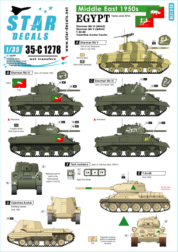 Middle East in the 1950s Egypt Shermans and T-34 tank markings. Sherman Mk III (M4A2), Sherman Mk V (M4A4). T-34/85(Sinai 1956). Valentine Archer tractor (Sinai 1956).