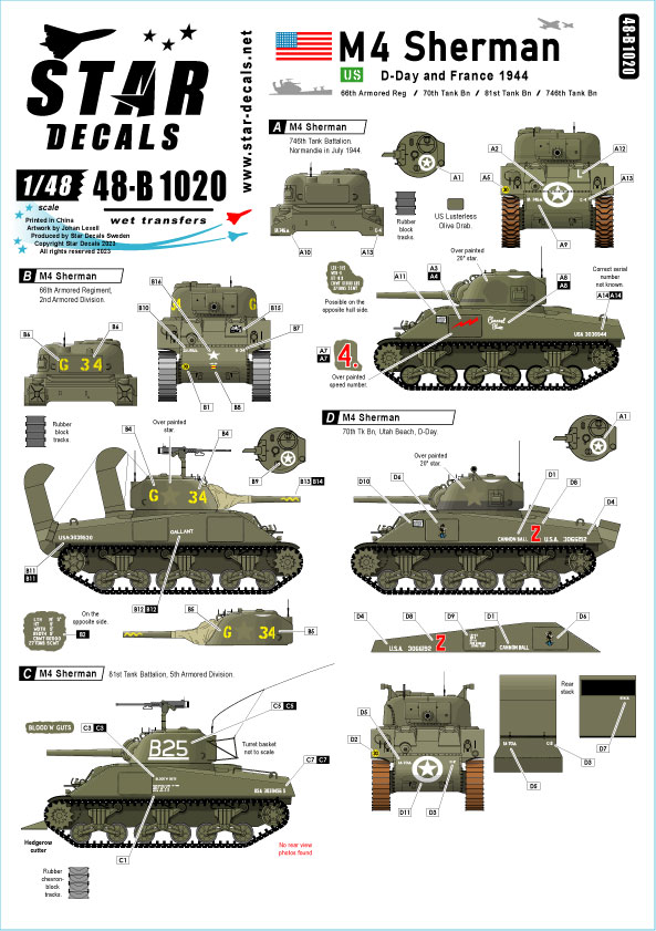 US M4 Sherman. D-Day and France in 1944. 66th Armored Regiment, 70th Tank Bn,81st Tank Bn and 746th Tank Bn.