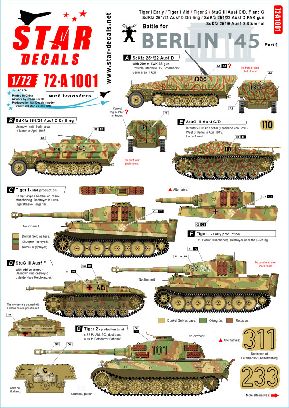 Battle for Berlin '45 # 1. German Tanks and AFVs in and outside Berlin 1945. Tiger I Early, Tiger I Mid, Tiger 2, StuG III Ausf C/D, F and G, SdKfz 251/21 Ausf D Drilling, SdKfz 251/22 Ausf D PAK gun, SdKfz 251/9 Ausf D Stummel.