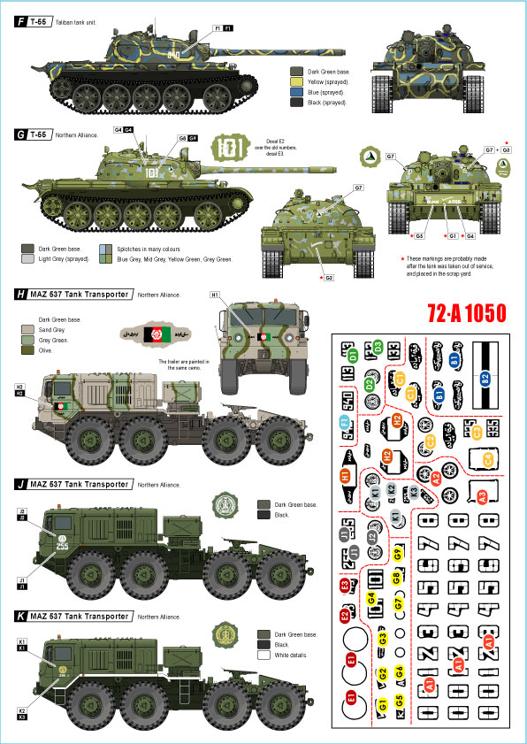 War in Afghanistan # 1. T-54B, T-55, T-55A, T-55AM and MAZ-537 Tank Transporter. Northern Alliance and Taliban markings.