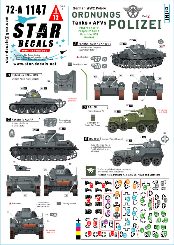 Ordnungs Polizei # 2. Tanks and Armoured Cars. Anti Partisan and Security service. PzKpfw I Ausf F VK.1801, Hotchkiss H38 or H39, PzKpfw IV Ausf F, BA-10M.